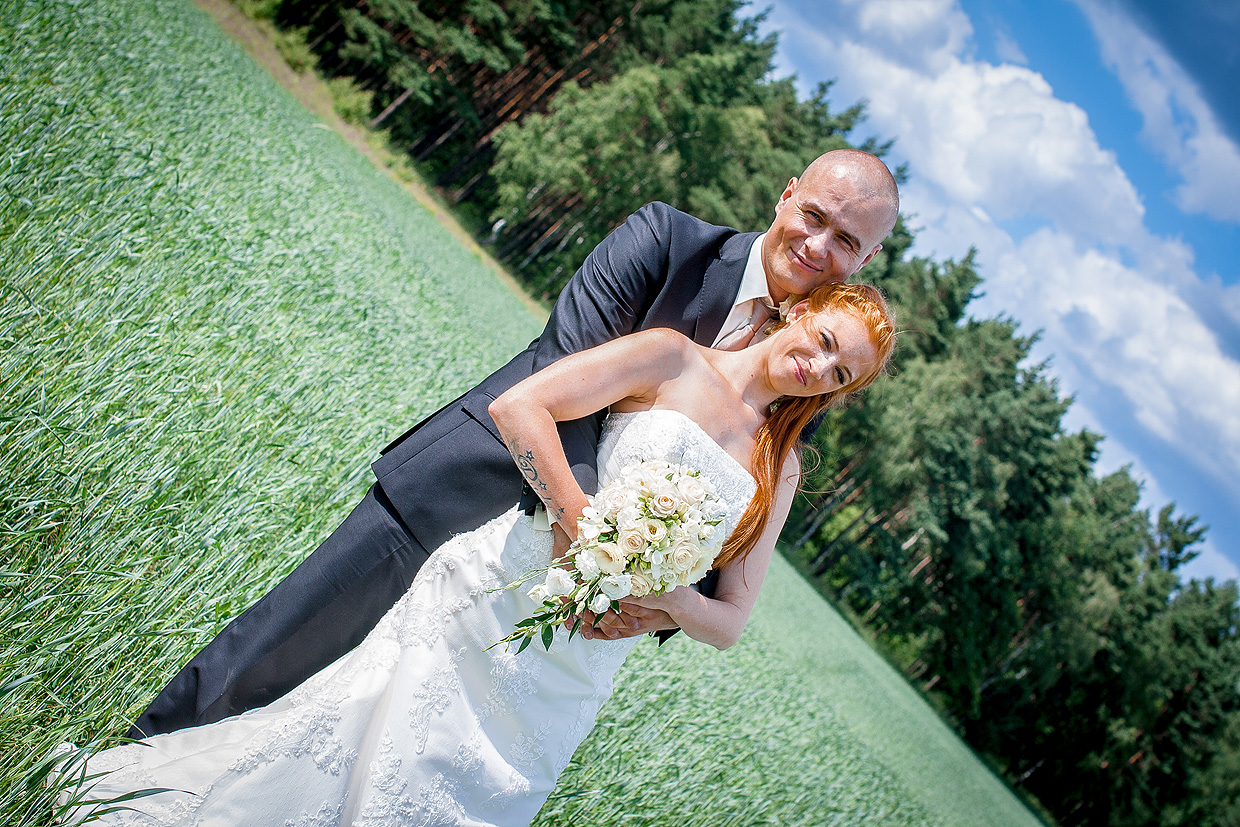 W naszej ofercie znajduje się sesja zdjęciowa w dniu ślubu. Trwa ona około 2-3 godzin i można podczas niej zrobić naprawdę super zdjęcia. Tak było z Moniką i Tomkiem. Udaliśmy się po ślubie cywilnym na sesję do stadniny koni. Zmuszeni byliśmy poczekać i sesja ślubna przeniosła się na pobliską łąkę.