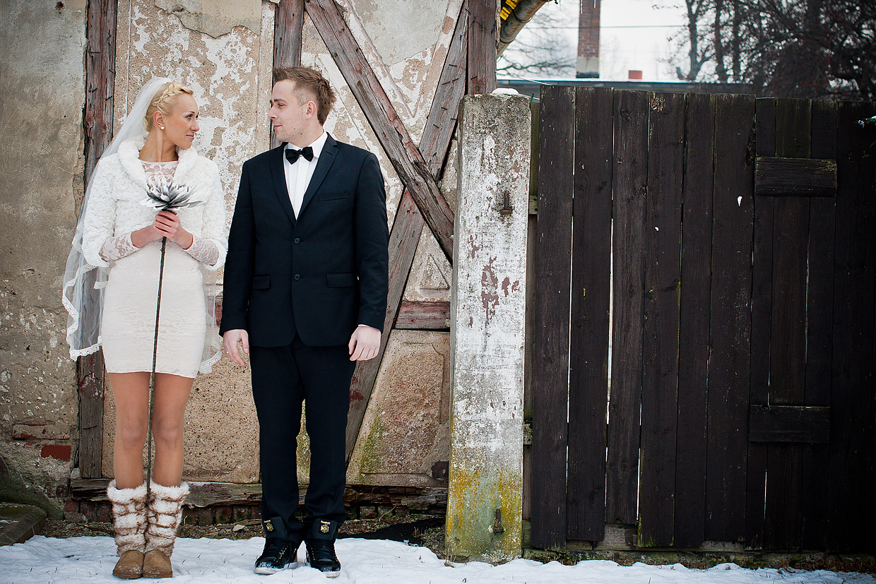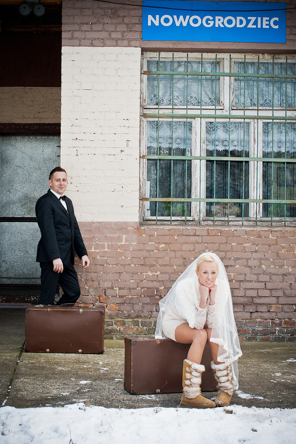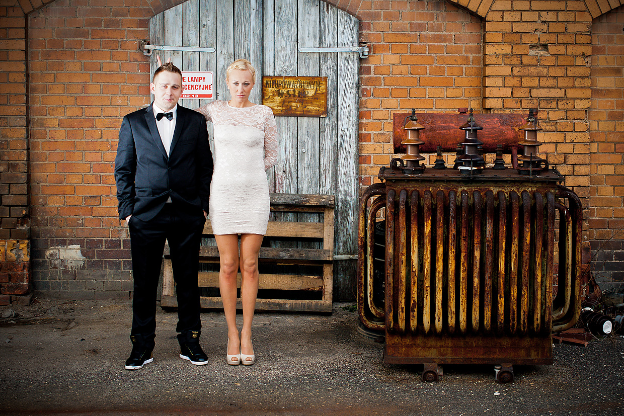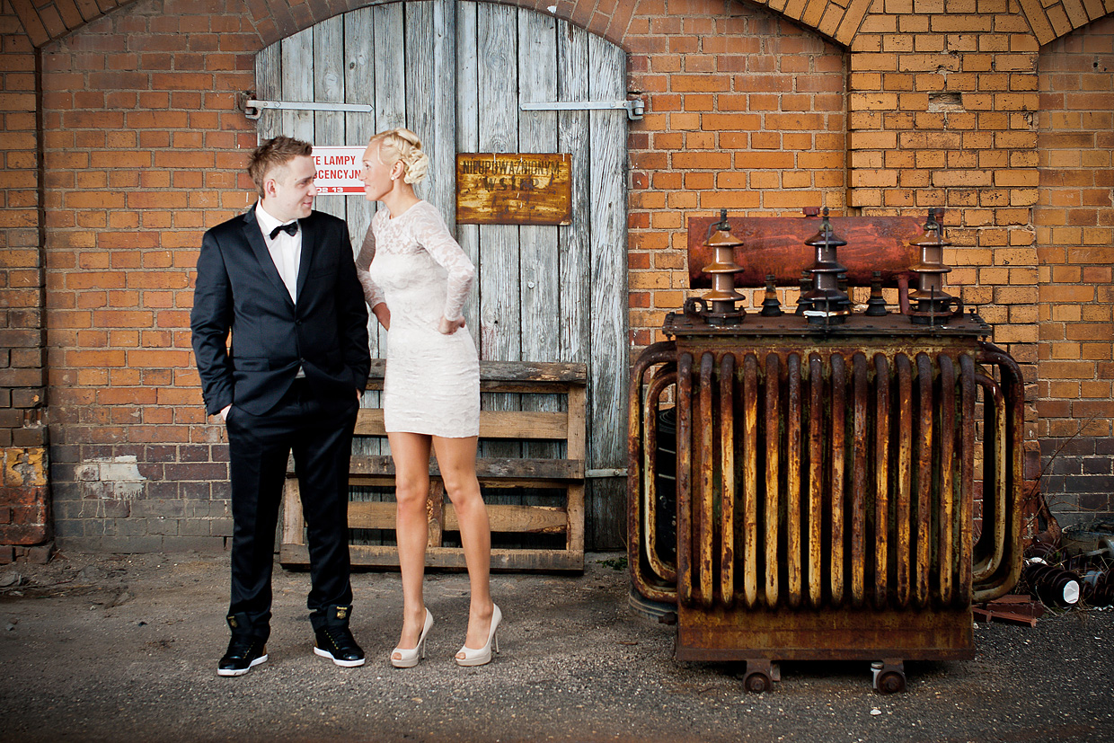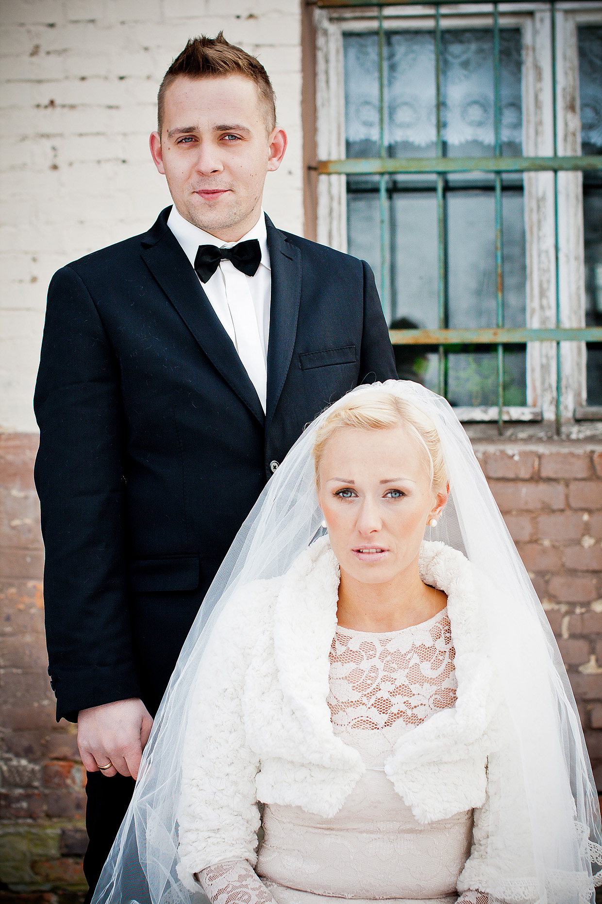 Klaudia chciała nietuzinkową sesję zdjęciową z mężem oraz w innym dniu sesję domowo – rodzinną, ale także ślubną. Taki mix do ogarnięcia nam się trafił. Zdjęcia robiliśmy w styczniu. Było kilkanaście stopni na minusie, ale Para Młoda dała radę. Na zdjęciach tego nie widać, ale Klaudia była bardzo zmarznięta. Michał pewnie miał z 5 podkoszulek pod garniturem. Nie chwalił się, ale coś było na rzeczy, bo znosił te mrozy jakoś lepiej. Zdjęcia robiliśmy w okolicy starej, nieczynnej stacji kolejowej w rodzinnym Nowogrodźcu. Potem udaliśmy się do “Klinkierni” i tam się zaczęło… Pierwszy raz przekonaliśmy się jak to miejsce żyło przez lata i jak cegła klinkierowa bajecznie wychodzi na zdjęciach. Potrzebowaliśmy też dodatkowego światła, żeby zrobić dobre zdjęcia w ciemnych pomieszczeniach, gdzie było dużo kurzu i mączki klinkierowej. Udało się i ze zdjęć jesteśmy bardzo zadowoleni. Kinga i Michał także.