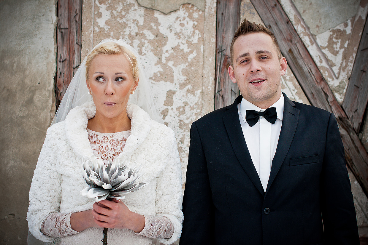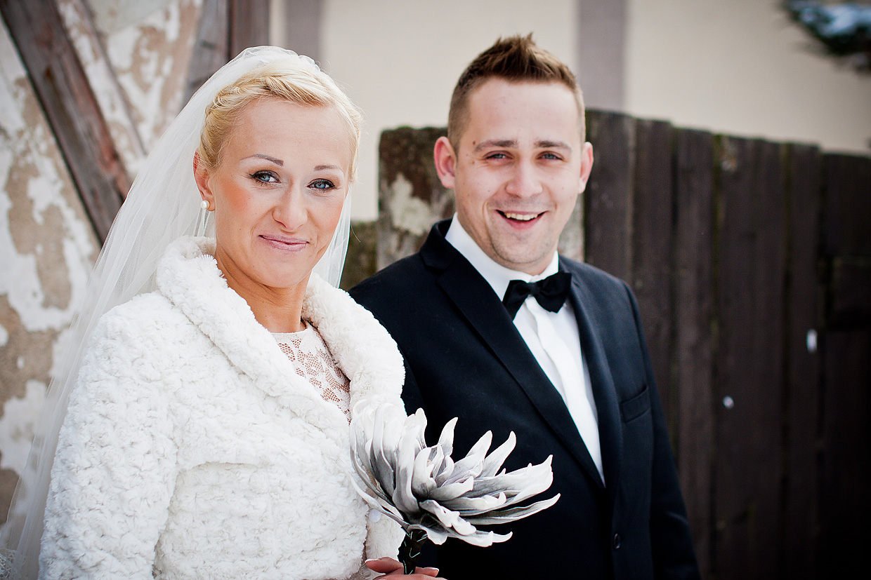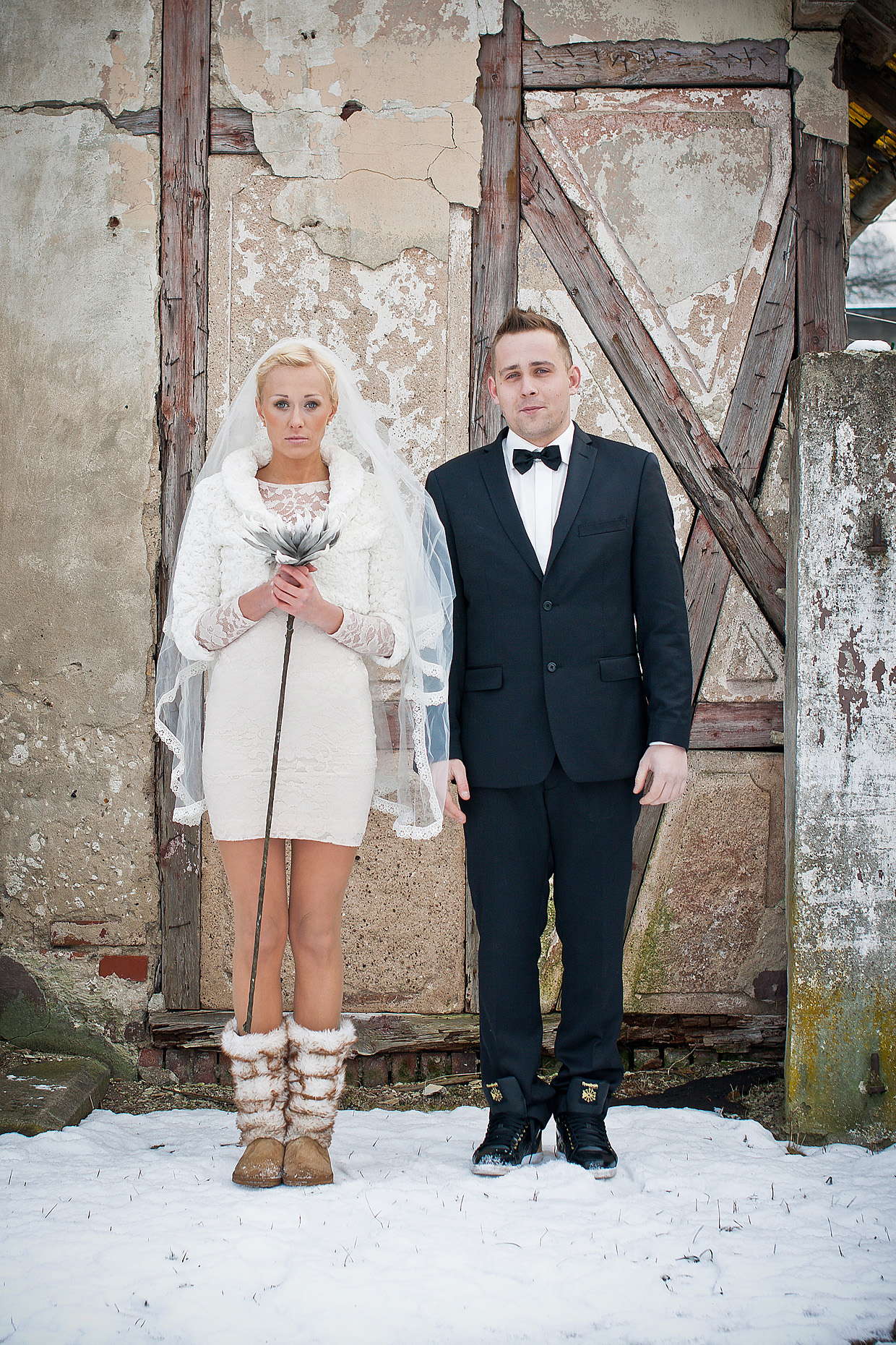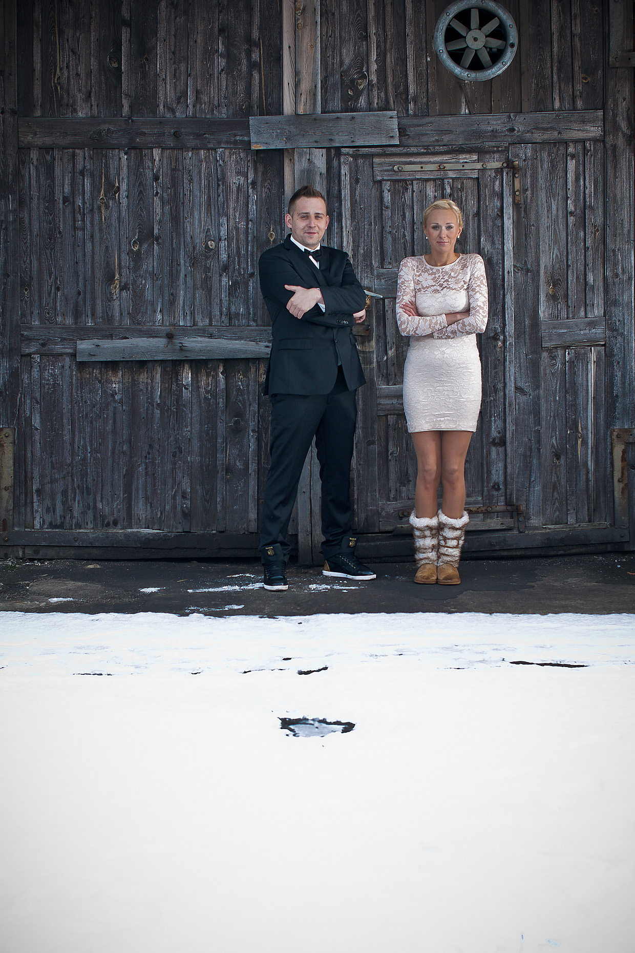 Klaudia chciała nietuzinkową sesję zdjęciową z mężem oraz w innym dniu sesję domowo – rodzinną, ale także ślubną. Taki mix do ogarnięcia nam się trafił. Zdjęcia robiliśmy w styczniu. Było kilkanaście stopni na minusie, ale Para Młoda dała radę. Na zdjęciach tego nie widać, ale Klaudia była bardzo zmarznięta. Michał pewnie miał z 5 podkoszulek pod garniturem. Nie chwalił się, ale coś było na rzeczy, bo znosił te mrozy jakoś lepiej. Zdjęcia robiliśmy w okolicy starej, nieczynnej stacji kolejowej w rodzinnym Nowogrodźcu. Potem udaliśmy się do “Klinkierni” i tam się zaczęło… Pierwszy raz przekonaliśmy się jak to miejsce żyło przez lata i jak cegła klinkierowa bajecznie wychodzi na zdjęciach. Potrzebowaliśmy też dodatkowego światła, żeby zrobić dobre zdjęcia w ciemnych pomieszczeniach, gdzie było dużo kurzu i mączki klinkierowej. Udało się i ze zdjęć jesteśmy bardzo zadowoleni. Kinga i Michał także.