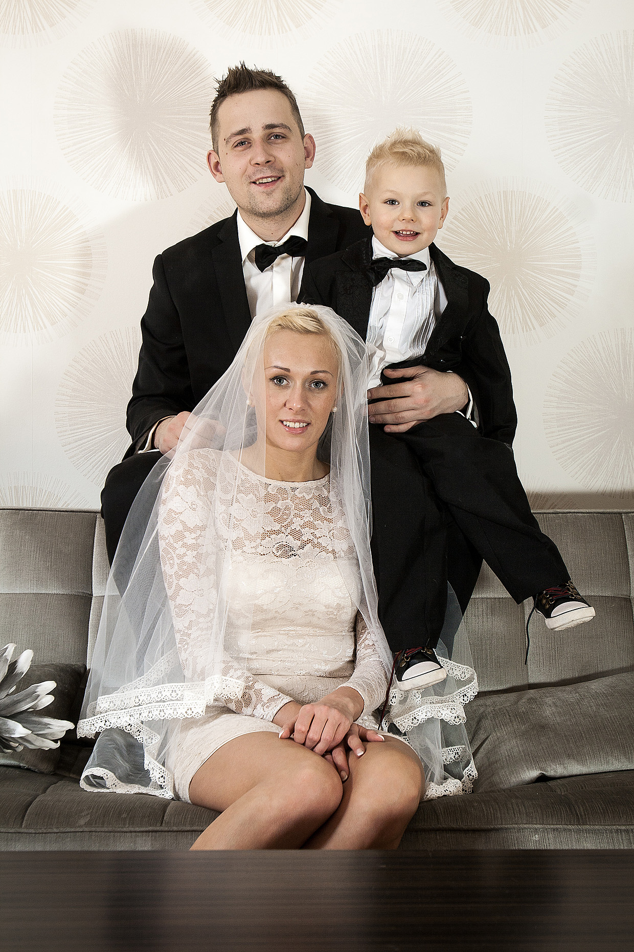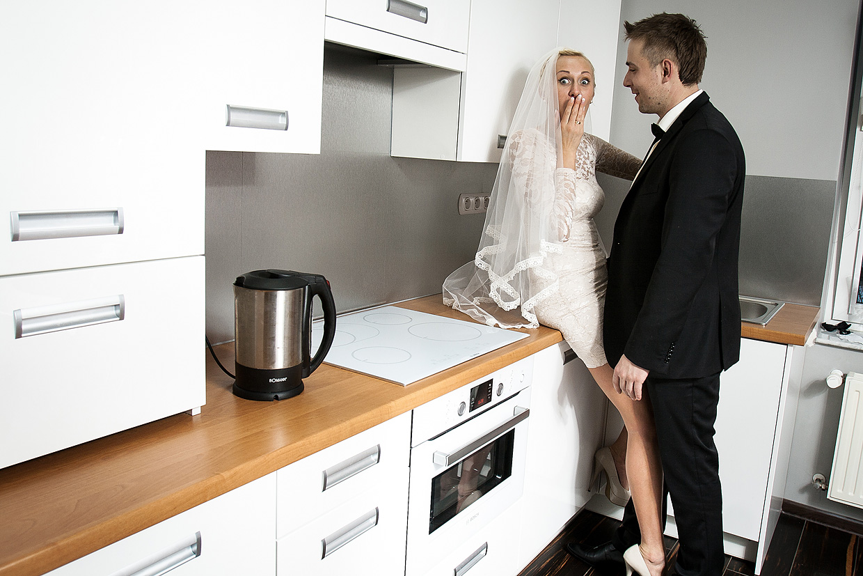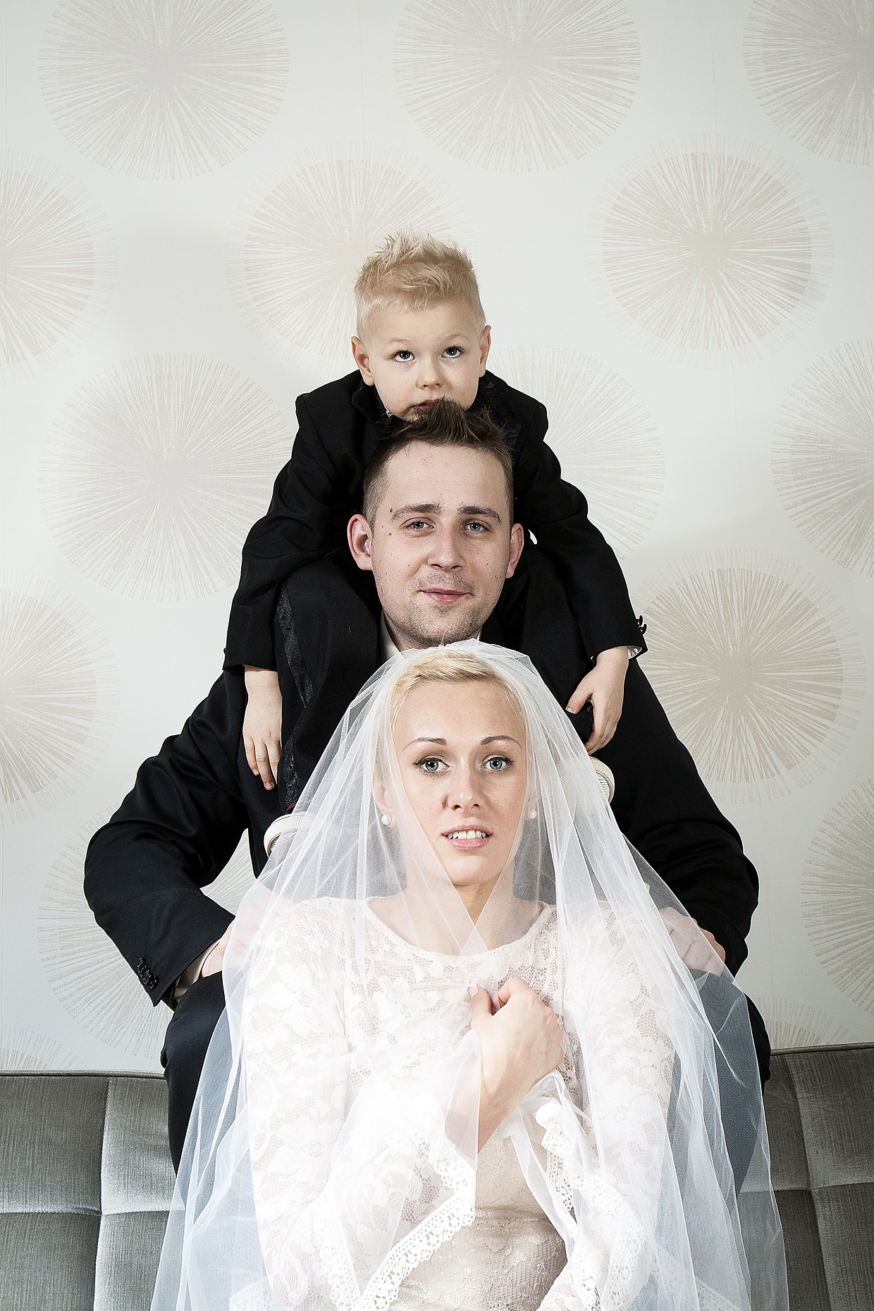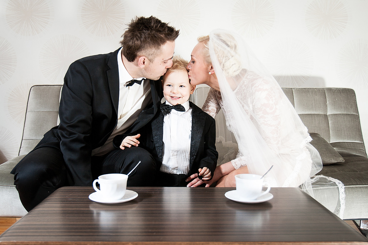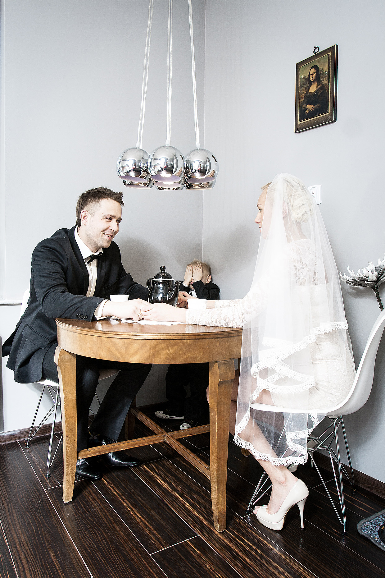 Drugi dzień zdjęć ślubnych rozpoczęliśmy w domu. Przytulne mieszkanko urządzone w stylu skandynawskim było w naszym guście i wykorzystaliśmy je w pełni do zdjęć, w których już uczestniczył synek Klaudii i Michała. Było poważnie, śmiesznie, romantycznie i wesoło. Mały rozbójnik nie pozwalał nam na chwilę odpoczynku i wytchnienia.